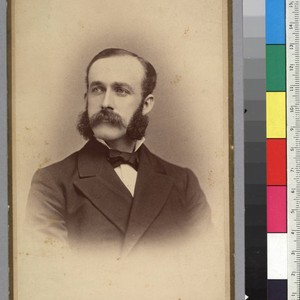 A studio photographic portrait of Henry E. Huntington, taken around the time of his first marriage to Mary Alice Prentice in 1873. He wears a dark suit and tie and has a thick mustache and mutton chop sideburns. Printed notes on verso read "P.R. Young McCrum Block, Oneonta, N.Y." MS notes on verso read "HEH, c. 1873" and "Metcalf, 1984." Another copy of this image, HEH 61/1/2 (4), gives the date as circa 1880.