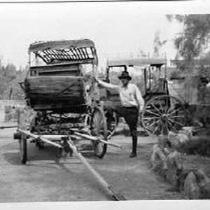 Shaver in front of old Death Valley wagons and coaches, at Furnace Creek Camp.