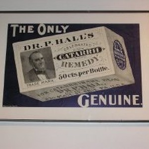 A framed poster with text and drawing of package of item being advertised DR. P. HALL'S CELEBRATED CATARRH REMEDY