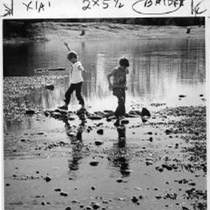 During a drought children play on a bridge of rocks they constructed on the American River near Watt Ave.