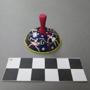 Noisemaker, metal blue & yellow bell shape with wooden handle. Graphic of women dancing with ribbon. Kirchhof products of Newark, NJ.