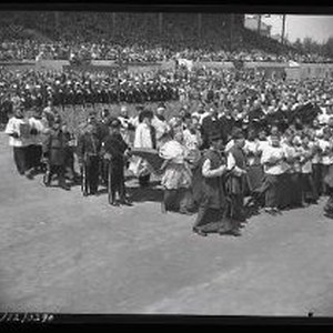 Eucharistic Congress - Fairgrounds - 4/30/50 - Crowd seated in grandstand and in foreground at fairgrounds. 14 of 20