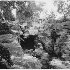 A view of a rocky, wooded area of the Japanese garden canyon. A similar image in photCL 107 vol3 box 2 pg74 refers to this area as the "rockery".