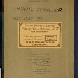 Pentecostal Missionary Union [PMU]/Assemblies of God [AoG] Home Reference Missionary Council [HRMC] minute Book No. 10 including Home Reference Missionary Council annual statement, 77 pages of index followed by 202 pages of minutes. All matters relating to Assemblies of God [AoG] Home Reference Missionary Council council member appointments, decisions, policy and missionary personnel issues [Description English/roman)]
