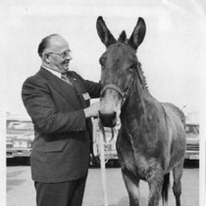 C. E. "Chet" Hinshaw, with a mule named Lucy, given as a gift upon his retirement as vice president of the retail and wholesale division of the Diamond Internation Corp. (lumber, building materials). He was a hunter, fisherman and outdoorsman with a fondless for the animals.