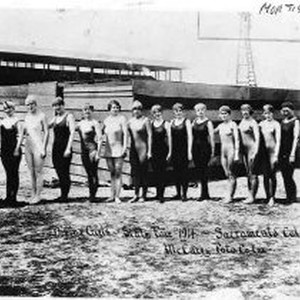Copy print from old print showing young women swimmers and divers who performed during the 1914 California State Fair. They performed exhibitions in the two tanks behind their line-up.