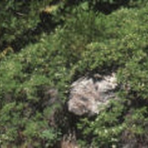 View of greenery with small white flowers carpeting a fallen tree trunk.