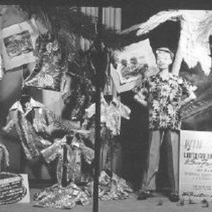 Window display at Weinstock's celebrates opening of new "Boys' Store." Includes Hawaiian sports shirts and decor. Sign advertises, "Win a United Air Lines Trip to San Francisco."