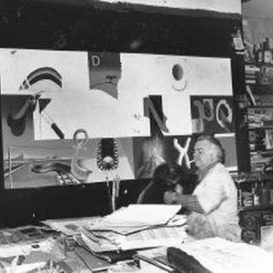 Artist Darell Forney at work on a painting in his studio. Dog beside him.