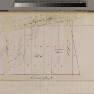 Pgs. 4-68 [not consecutive pages] of bound volume, "Subdivision of Lots 500, 501, 502 and 503 of Canal and Reservoir Lands," maps of varying sizes, showing block & lot numbers, penciled details, hachures, parcel owners, field notes; Block 13 having the most detail & note activity [bordered by Mill, 4th, Pearl & 5th streets]. Alt title supplied by cataloger.