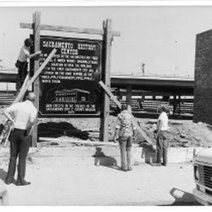Installing the sign announcing the "Sacramento History Center by the Friends of the Sacramento City and County Museum, 1975." From the left, Art Haarmeyer, Unknown, Bill Gaylord, Ed Sayre, Unknown, Unknown woman, Unknown man (far right), and Joe Angelo all working on the sign.