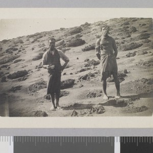 Two native Hawaiian men, one with a pipe, stand near volcano.