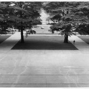 Exterior view of the California State Capitol building taken from the balcony, looking west. The old lawn terrraces have been removed and two large magnolia trees were removed that stood directly in front of the walk way.