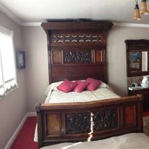 Bedstead, Renaissance Revival style, walnut and laurel wood, pierced and carved wood, applied burl veneer; full-sized. Includes:a) a straight pediment that spans the entire top of the headboard which has curved brackets on each side. It is surmounted with a carved scroll in the center. The remainder has pierced and carved circles and half -circles. This pediment sits on top of the b) tall rectangular headboard. The top section is pierced with scroll and foliate carvings; the middle has a central panel with applied scroll and foliate decoration.A panel with applied burl wood veneer is on each side of the central panel. The bottom section is plain wood c) The rectangular footboard has flat top rail with egg shaped carvings along the edge. The front of the footboard has a center panel with the same scroll and foliate applied decoration that is on the headboard. The side burl wood veneered panels are on either side of the center panel. d-e) 2 wood bed rails with metal hooks on each end. f-i) narrow, plain wood bed slats. j-m) 4 plain wood rail reinforcements. n-q) 4 metal casters (new, not original)