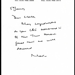 Correspondence from Sir Martin Laing to Charles Handy congratulating Handy on his C.B.E. award, January 5, 2000; Charles Handy Papers; Box 13, Folder 9; 1 page