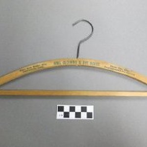 Wood pants hanger with metal hook, "Hall Cleaning & Dye Works 2103 Weller Way, Sacramento"