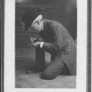 Photo--black and white, in studio folder: Luther Burbank is seen kneeling, possibly examining a seed. Photograph by Nelson Studio of Santa Rosa, California.
