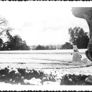 A view of the area south of the library building and east of the Huntington residence after a rare southern California snowfall. There is a snowman on the library lawn facing away from the camera. MS note on verso reads "Feb. 1948" and "Huntington grounds".