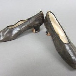Women's brown leather dress shoes with one-inch Louis heels. Square toe and high vamp. Label: "Laird, Schober & Mitchell, Philadelphia."
