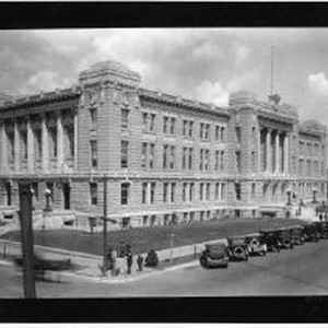 Oblique view of entire courthouse with cars parked in front and pedestrians on sidewalk. This was Sacramento's third courthouse, built in 1913.