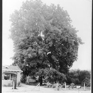 Photo--black and white: The "Miller" Black Walnut -Sebastopol, summer 1930. The tree is fully leafed out with a house on left. The Miller Ranch was between Santa Rosa and Sebastopol on Bodega Road. Burbank gave 3 seedling trees companion to the "Royal" to have tested elsewhere. This is only one of the trees he could afterwards locate. Given to & planted by Mr. Gillmin of Santa Rosa, CA in 1887.