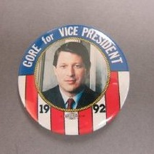 White text on blue background w/red & white stripes. "Gore for Vice President 1992" w/photo of Al Gore