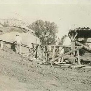 View of the Grizzly Slough Bridge during construction. Shows workers building sub-structure. This slough is near the junction of the Mokelumne & Cosumnes Rivers and the town of Thornton.
