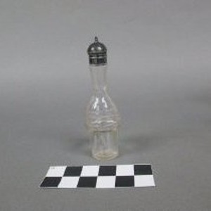 Caster, clear glass with etched leaf pattern and cut dimples repeated around mid section. Silver-plate screw-on stopper shaker. 1890s, c.