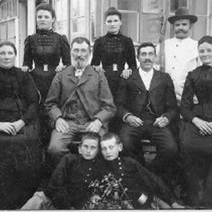 Professional portrait of a nine-member family group in Russia. Alexander Ansen, donor's father, is in top row at far right.
