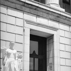View of a Greek Revival sculpture (goddess of climate) beside the entrance to the State Treasurer's Building across the street from the Capitol. Was in use as a "Capitol extension building" at the time.