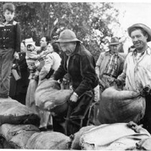 Two men pile sand bags on a wall while families watch.