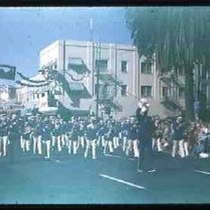 Views of Armistice Day parade on J Street at the corner of 9th street. This is a view of an unidentified band in blue and white uniforms. The slide is dated November 11, 1955