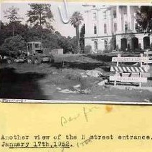 Typed on binder page "Another viw of the N street entrance [capitol park]. January 17th, 1952" View of park driveway being demolished; capitol in background.