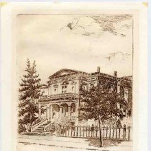 Seven pen and ink drawings by artist Ted Baggelman and presented to the donor. Views include Sacramento buildings and the Columbia Gazette in Columbia State Park, California along with a landscape of Elephant's Back, Coyles Lake in Alpine County, California. The landscape also includes the original copper plate engraving.