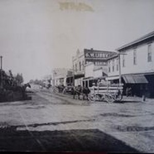 Photo -black and white: North Main Street Sebastopol circa 1900. G. W. Libby sign and Crawford and Weeks wagon and store.