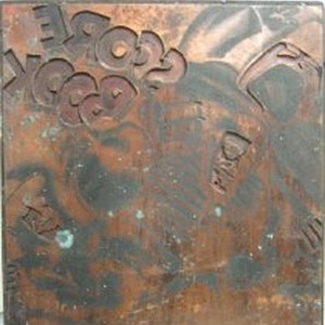 Copper print plate depicting a stylized image of a ball player and catcher or umpire. Ball player could be sliding into home plate avoiding a tag from the catcher. Caption reads: "SCORE BOOK." Second of two identical plates.