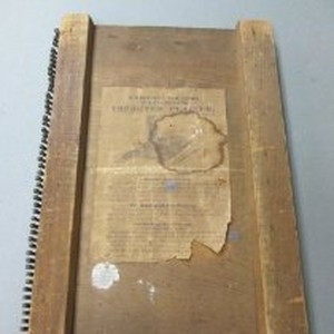 Pleating machine, wood, metal and paper, brown. Text "Directions for Using Young's Improved Pleater", additional text provides detailed instructions for making types of plaiting. Machine is a block of wood with thin metal moveable strips at regular intervals which can be lifted up in order to place material in position for plaiting.