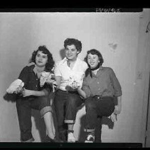 Three unidentified women wearing jeans, shirts and neckscarves holding what appears to be dusting rags.