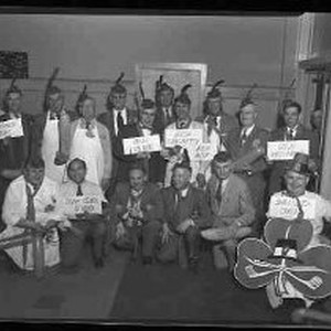 SERIES - Two views of men wearing small caps with feathers, ballons, name signs and a large shamrock shaped poster. Original container marked "F.O.E. Eagles"
