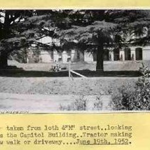 Typed on binder page "Picture taken from 10th & M street.l.looking towards the Capitol building..Tractor making the new walk or driveway...Jane 19th, 1952." view of excavation site through trees with part of capitol buildingin background.