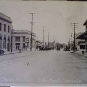 Photo--black and white: cardboard backed. South Main Street, Sebastopol circa 1925 looking south. Ralroad tracks of the P&SR are visible on Main Street. The Worth Drug Store and First National Bank on the left. The stone WCTU water fountain is on corner next to Worth. Vintage cars are parked all along the street. Crawford building is on the left and the First Congregational Church and steeple can be seen in far background.
