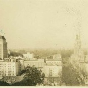 An elevated view of downtown Sacramento, looking East down K Street. Cathedral of the Blessed Sacrament and the California State Life Insurance Building ( marked with X) visible.