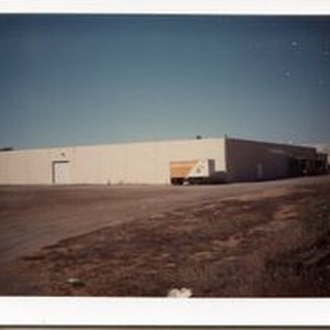 Photo, color: O. A. Hallberg & Sons Apple Products cannery in Graton, CA. Juice plant and warehouse with view of trailer that had old design label from Hallberg's. Circa 1960s