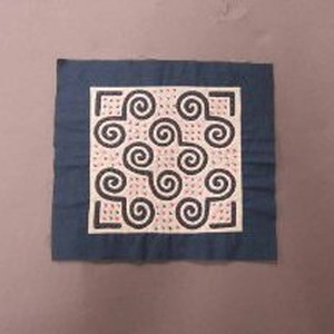 An applique square of blue cotton, hand-made by an unidentified member of the local H'Mong community.