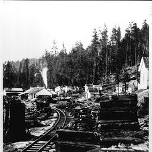 Photo--black and white: Northwestern Pacific (NWP) railroad narrow gauge tracks at Streeten's Mill, Camp Meeker 1883. The saw mill is seen at the left with smoke stack. The loggers camp of small buildings is seen to the right.