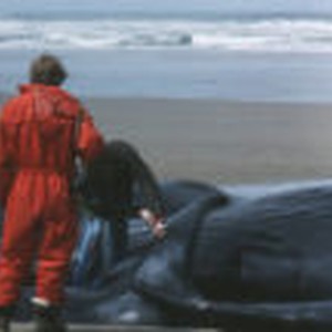 Veterinarian taking a blood sample from the fluke of a beached whale while a Greeenpeace member looks on.