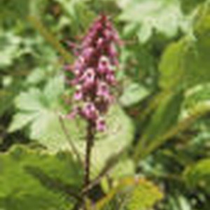 Close-up of cluster of pink flowers with large leaves in the background. Photograph was taken at an approximate elevation of 12, 095 feet.