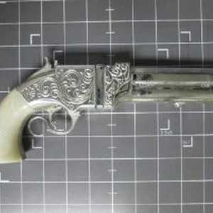 Plastic gun modeled after 18th Century flintlock pistol. White plastic grip. Barrel can be removed. Was manufactured by Avon as a container for cologne. While bottle is empty, it still has a strong smell.