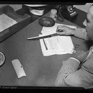 Evidence being measured. Knife and tapes on detective's desk. 7/1955