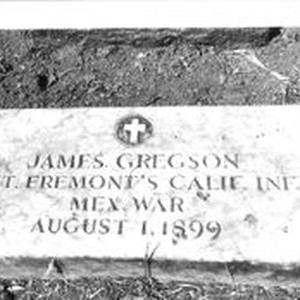 Photo--black and white: The headstone grave marker for James Gregson (b. 9/14/1822 England--d. 8/1/1899 Green Valley). The marker states Gregson was a Private in Fremont's California Infantry--Mexican War. Gregson was an early pioneer to Green Valley (Graton) in 1845 and is buried in the Green Valley Cemetery in Graton.